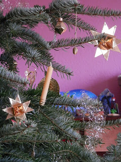 Kugeln aus Papier ausgeschnitten, Fröbelsterne und Deko aus Metall (z.B. von Jette Fröhlich). Falls doch noch etwas aufgehängt werden soll, was zerbrechen kann, dies weit oben platzieren. ;-)